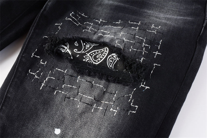 Elevate denim through meticulous craftsmanship and innovative design. Made from premium Italian stretch denim with 92% cotton, 6% elastane, and 2% spandex, they provide exceptional comfort and flexibility. Hand-distressed details and crinkled suede patches enhance their artisanal appeal, complemented by classic five-pocket construction. A specialized treatment creates nuanced tonal and color variations, ensuring each pair possesses a distinct and refined character suited for discerning style connoisseurs.
